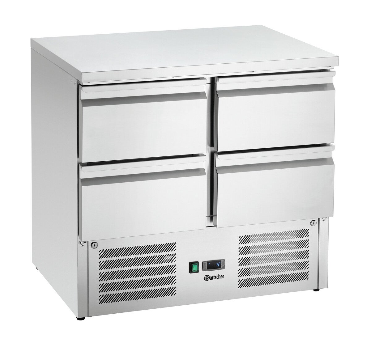 I 4 cassetti refrigerati del mini tavolo refrigerato possono essere utilizzati sia senza che con contenitori GN fino a GN 1/1 per lo stoccaggio. Il filtro in acciaio inox lavabile in lavastoviglie e l'unità tecnica facilmente accessibile consentono una manutenzione semplice e regolare e quindi una maggiore durata.