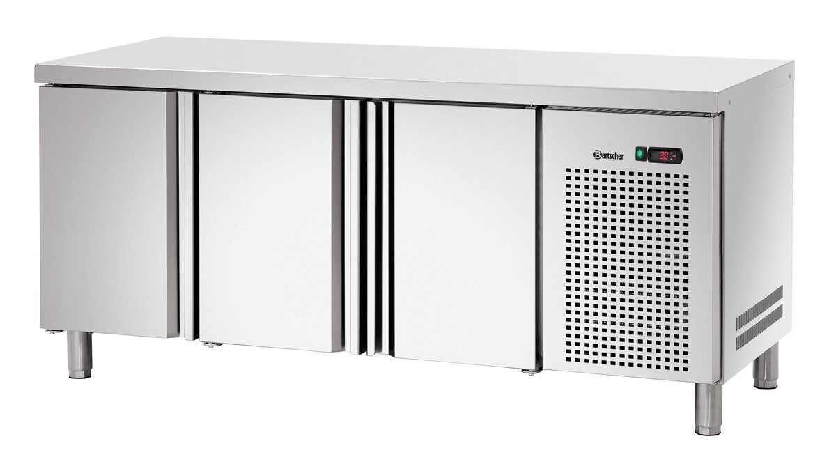 Tavolo refrigerato a 3 sportelli con piano di lavoro in acciaio inox di alta qualità e un'ampia area con refrigerazione ventilata: temperatura di raffreddamento costante e uniforme all'interno.