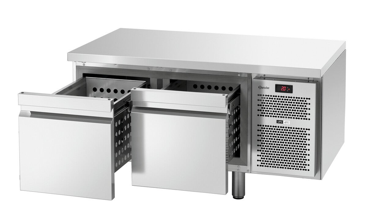 Nel tavolo refrigerato da sottopiano con 2 grandi cassetti trovano spazio contenitori GN fino a 200 mm di profondità. Grazie all'intervallo di temperatura da -2 C a +8 C è possibile raffreddare svarianti alimenti.