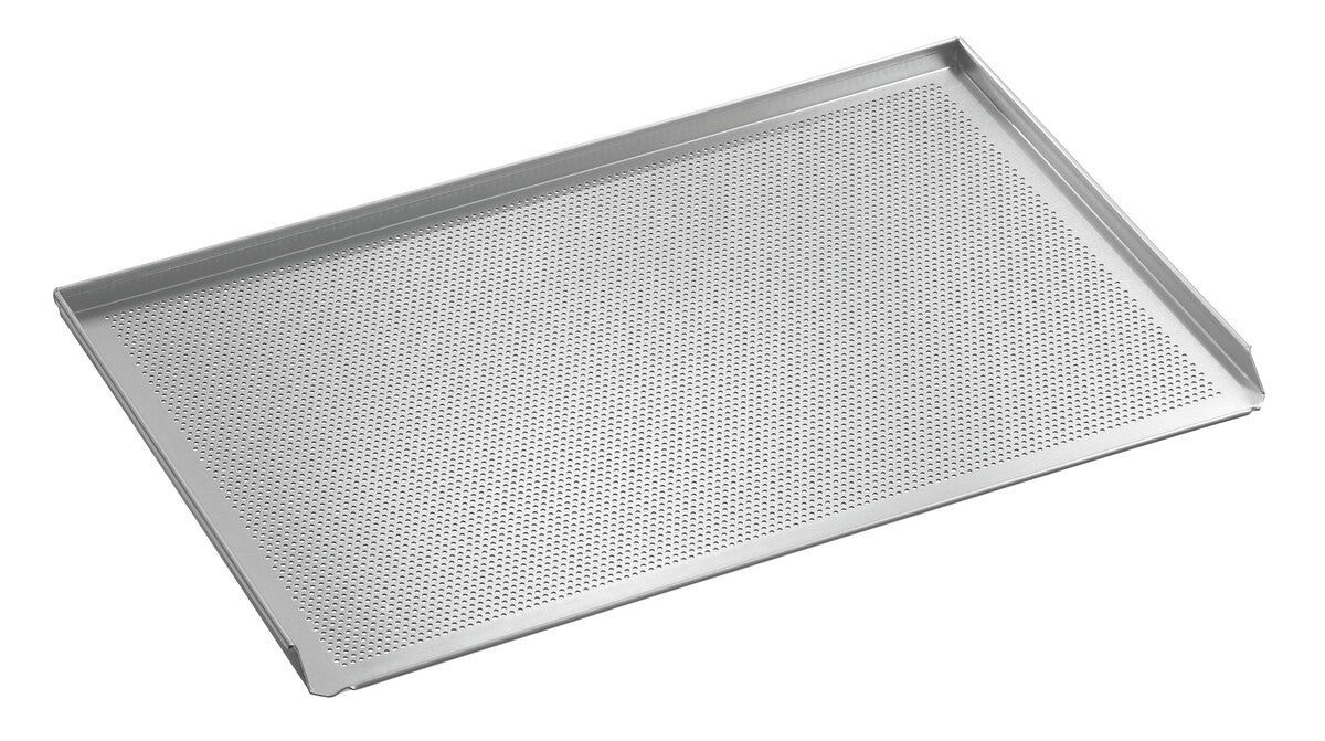 La teglia forata in alluminio nel formato standard 600 x 400 è resistente alle temperature fino a 260 °C. Il bordo su 3 lati consente una cottura e un trasporto sicuri.