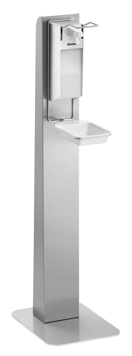 Dispenser di disinfettante, vassoio di sgocciolamento e colonna di disinfezione forniti come pacchetto igienico mobile. Grazie alla solida struttura in acciaio inox, il set può essere utilizzato ovunque, su superfici piane, a seconda delle necessità e senza bisogno di fissaggi.